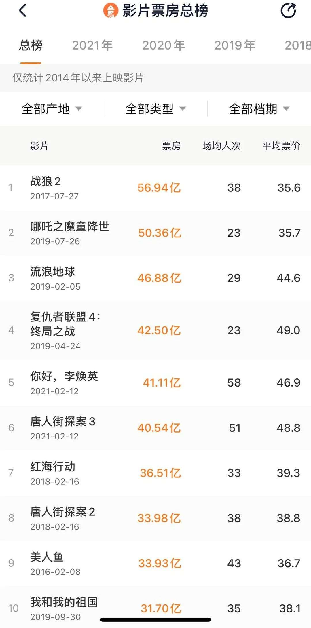 这是截至2021年2月22日下午16时,中国影史的前10大票房影片。在工业化水准上及格的,有《战狼2》和《红海行动》,流浪地球可以打80分,这才是中国第一部追平好莱坞水平的工业大片。