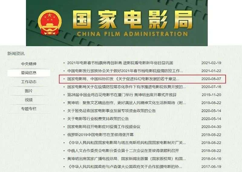 但我们还真有证据。这是国家电影局网站上的要闻信息栏目。从2017年到现在共有15条新闻,大部分是例行的交流活动和相关政策解读,关于本行业的专门政策只有一条,就是这个《关于促进科幻电影发展的若干意见》。为什么要专门针对科幻电影出政策呢?