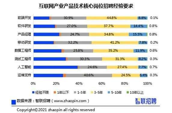 技术领域中的前端开发更青睐技能娴熟的人才,53.8%要求经验在3年及以上,其中44.8%集中在3-5年经验。软件研发以及产品经理排在其后,这两岗的学历要求同样较高,也意味着岗位人才的不可代替性更强。运维支持对学历和经验要求则较为宽松,入行门槛最低。