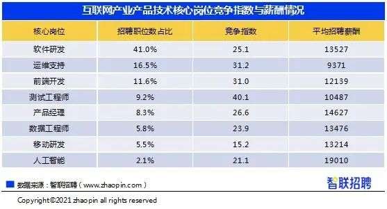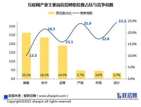昨日,智联招聘发布《2021年互联网产业求职指南》显示,互联网产业6大主要岗位中,招聘职位数最多的为销售,占比20.1%,竞争指数13.3,也就是说,平均13.3人竞争一个职位。