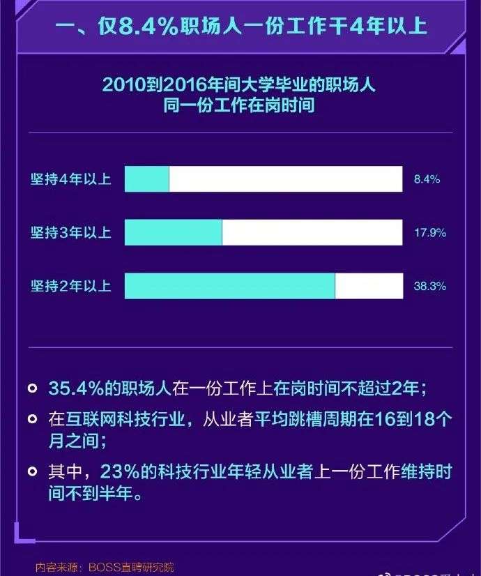 1月6日,BOSS直聘发布《2020职场人跳槽观察》,数据显示,仅8.4%职场人一份工作干4年以上。在互联网科技行业,从业者跳槽周期在16到18个月之间,其中,23%的科技行业年轻从业者上一份工作维持时间不到半年。