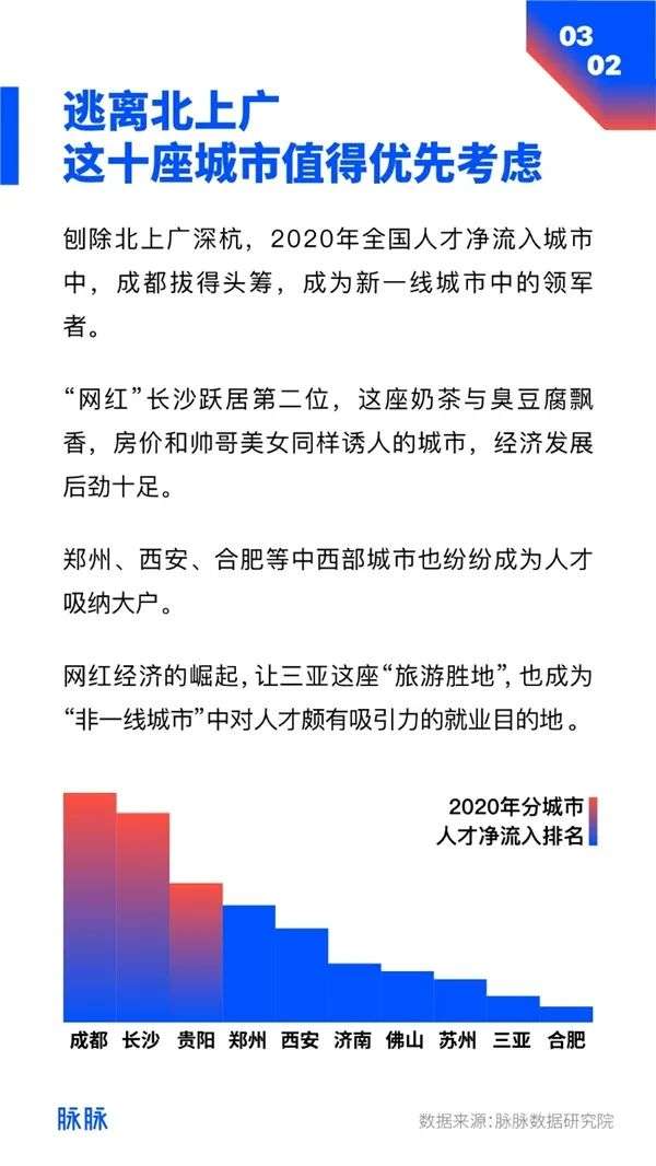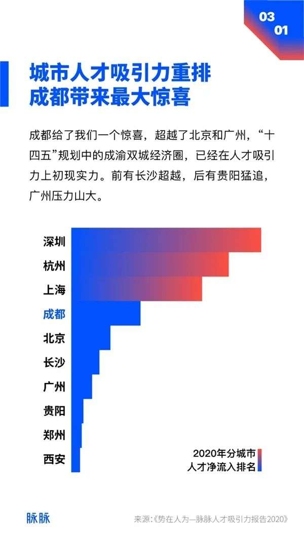 日前,脉脉发布《人才吸引力报告2020》,报告认为,成都人才吸引力已经超越北京和广州,排名第四。