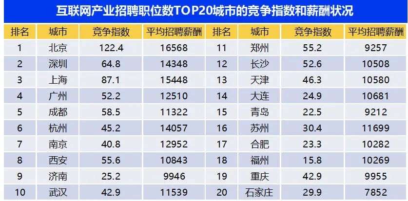 在招聘职位数最高的20个城市中,前5依次为北京、深圳、上海、广州、成都。