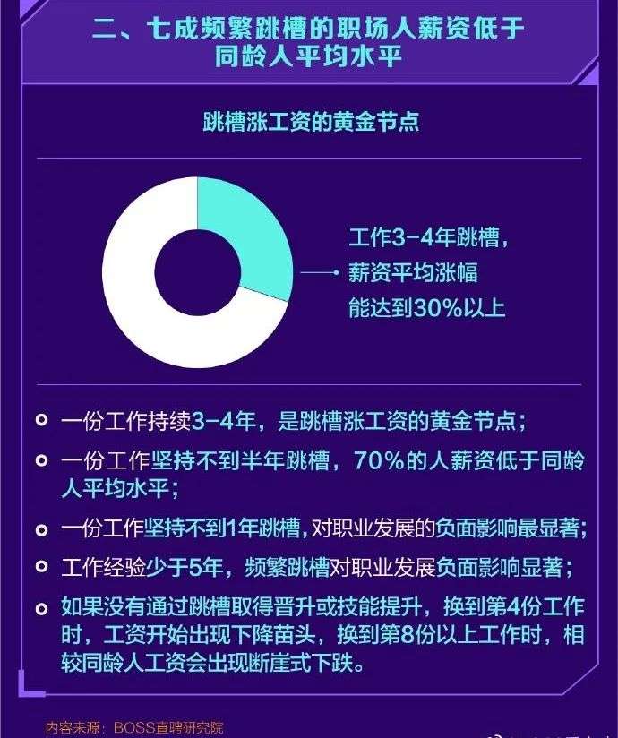 BOSS直聘认为,频繁跳槽带来的"收入惩罚"现象在拥有大专及以上学历的人群中尤为明显:上一份工作坚持不到半年就跳槽的求职者中,70%的人薪资低于同龄人的平均水平。