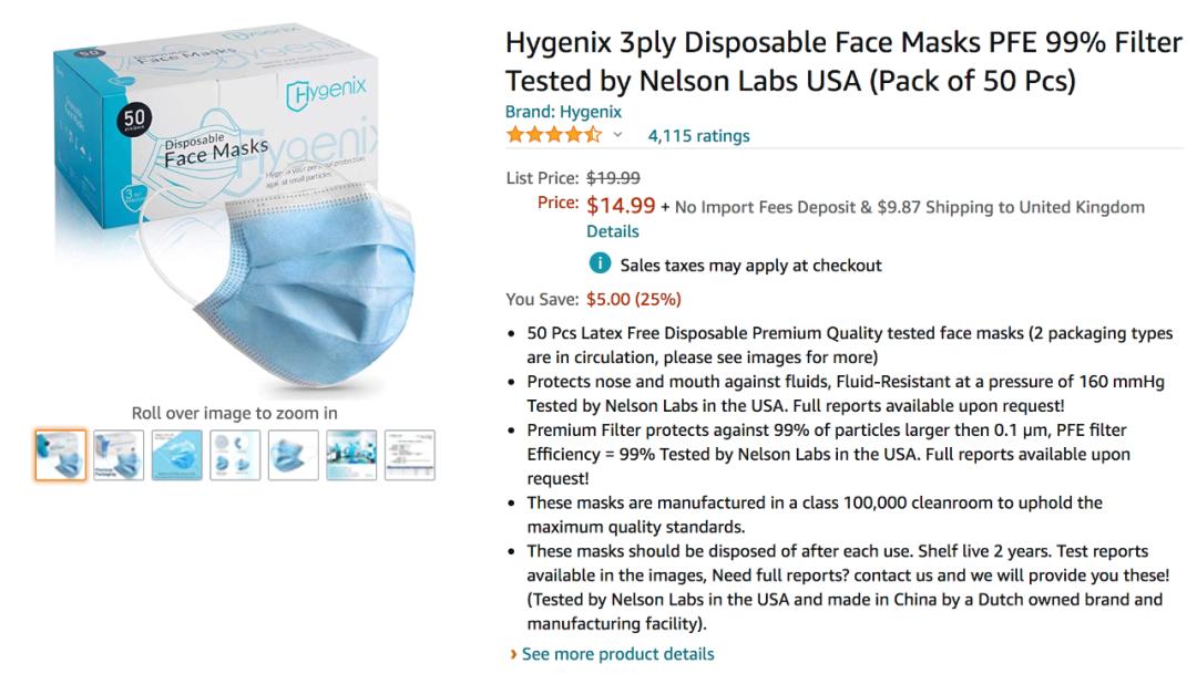 一盒 50 只装的普通医用防护口罩,售价 14.99 美金,算是非常良心的价格了。