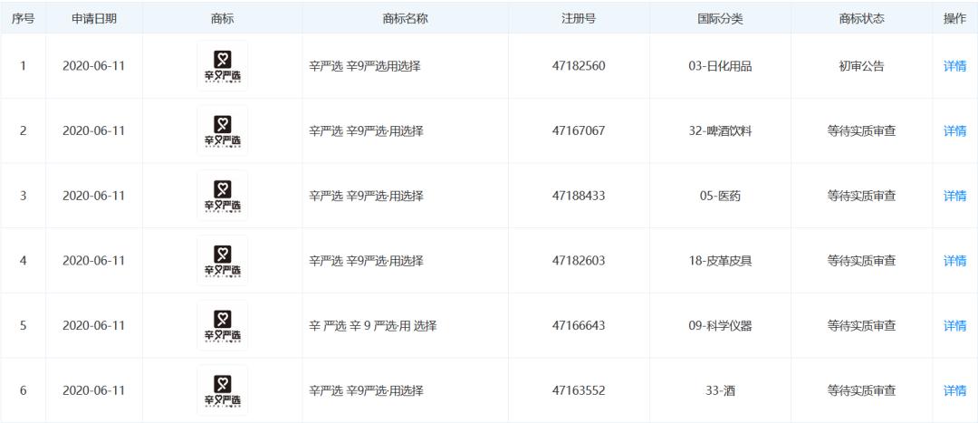 值得注意的是,该公司2020年6月申请注册了“辛严选、辛9严选·用选择”等商标,目前仍处在等待实质审查阶段。2020年3月份还注册了“老铁们”“榜大哥”等商标,其中有的商标已通过审核。