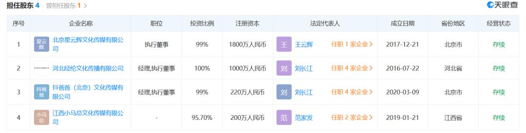 据天眼查资料显示,刘长江旗下共有四家公司,北京星云辉文化传媒有限公司、河北经纶文化传播有限公司、抖爸爸(北京)文化传媒有限公司、江西小马总文化传媒有限公司。其中江西小马总文化传媒有限公司的法定代表人为范小勤的爸爸范家发。