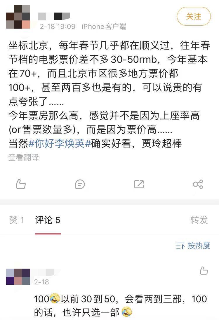 最大的火力来自北京、上海等一线二线城市,“春节档一部2D电影80元,我这是坐在演员腿上看电影?”“影院平时二三十元,春节都过百了,涨价也太离谱了”“在北京过年,往年春节差不多30元-50元,今年基本都在70元+,很多地方都100元+,甚至200+的也有,贵得有点夸张”。