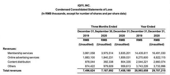 这对爱奇艺的营收造成了影响。从2018年起,会员收入成为爱奇艺营收占比最大的一块。根据财报,爱奇艺2020财年第四季度营收为人民币297亿元,其中会员服务收入为人民币164.91亿元,在总营收占比为55.53%。这部分收入的增长放缓,必然对平台会形成结构性影响。