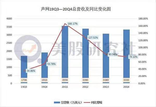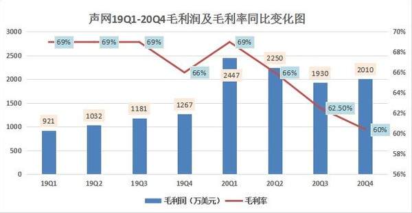 财报显示,声网实现营收3325万美元,同比增长74.1%,环比下滑6.44%。自20Q1季度起2020年声网的营收环比都有所下滑。
