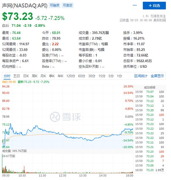 美东时间2月22日盘后,声网公布2020年第四季度和全年财务业绩,2月23日,或受亏损扩大影响,财报发布后声网股价一度暴跌19.50%。从资本市场情绪来看,声网的这份财报表现似乎不是很理想。截止目前,声网股价为73.23美元,总市值为72.66亿美元。