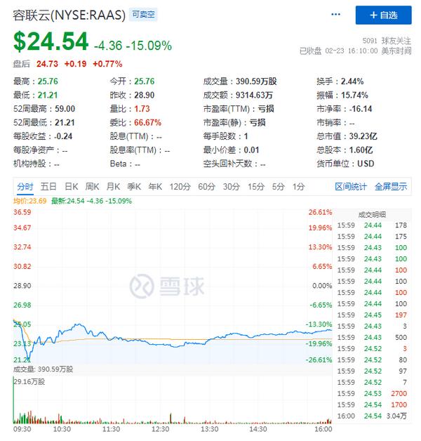 做为中国通信云赛道内的领头羊代表,声网与容联云一直被拿来作比较,尤其是两家公司都选择在美股上市。或受声网财报不理想股价波动影响,容联云当天相应下跌13.47%。截止目前容联云股价为24.54美元,当前总市值为39.23亿美元。