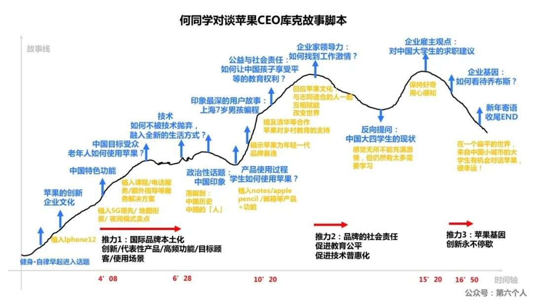 整个内容在2-10分钟之间,进入了一个信息量和颗粒度都非常密集的时段:这里从Iphone12上市为切入点,提及了苹果的新品、团队创新;而后马上转入基于中国用户的「特色功能」,而后瞬时话题跳转到了「老年人很难使用苹果」痛点问题,将中国市场、中国受众、产品作为解决方案涉及的延伸服务等核心问题抛了出来。