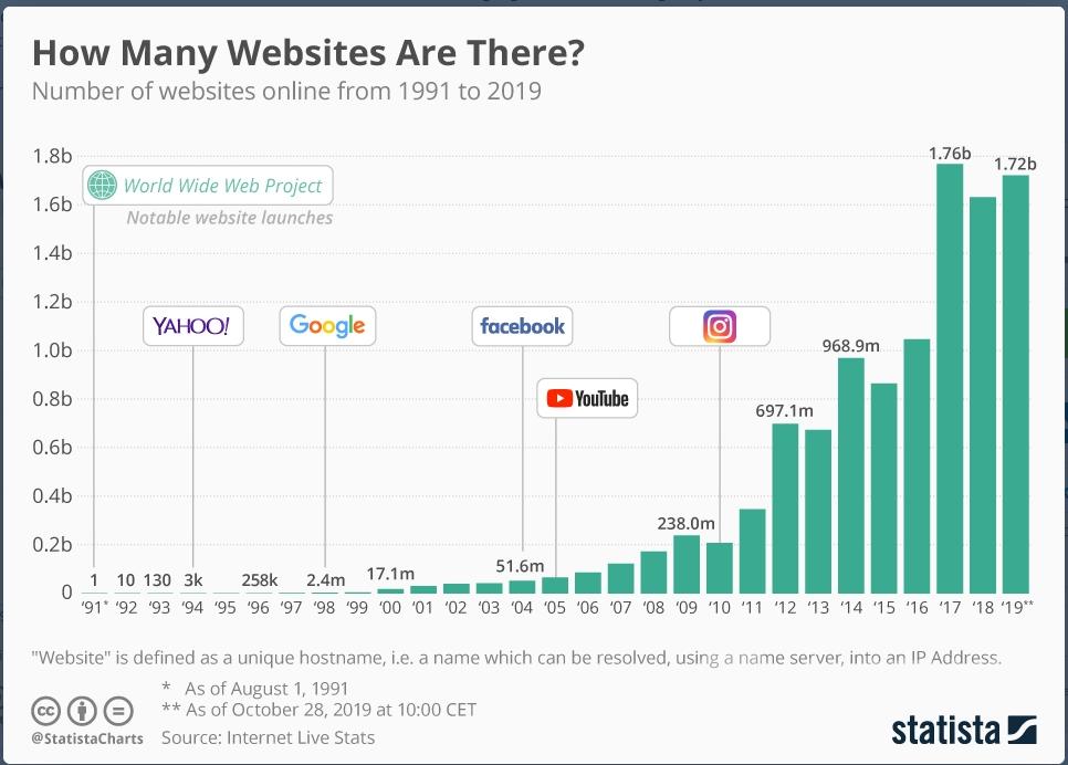1991-2019 年全球网站数量变化 单位(十亿)