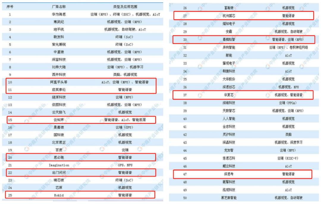 然而,这一领域同样高手林立。中商产业研究院列出的中国人工智能芯片50强榜单中,有10家的类型及应用范围都包括智能语音,其中甚至有阿里平头哥这样的巨头分支。