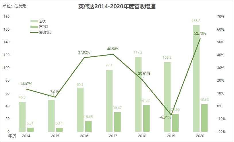 就在今天早上,英伟达刚刚公布了其2021财年(2020年度)财务数据,公司年度营收与净利润都创下历史新高——营收166.75亿美元,同比增长53%,净利润为43.32亿美元,同比增长55%。