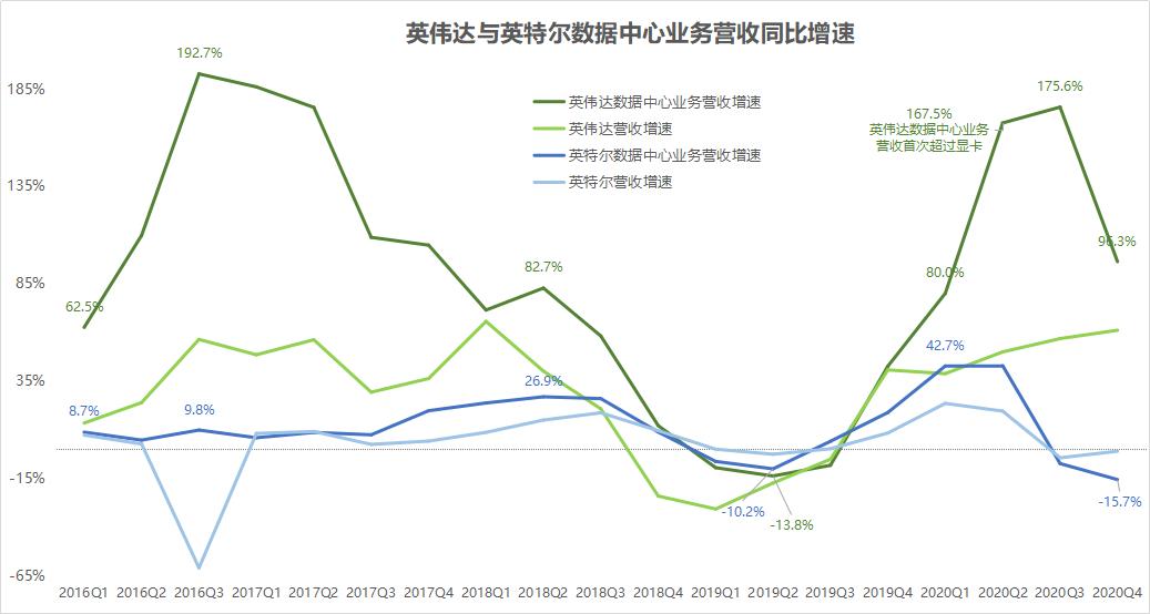 英伟达与英特尔数据中心业务增速 36氪制图