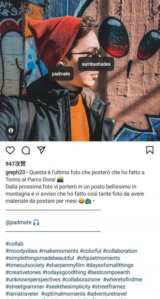 除了请到 NBA 球星外,Padmate 也会请一些 KOL 通过社交平台做带货。在 Padmate 的 KOL 列表中包括了来自美国、德国、意大利等多个国家的 KOL。这些 KOL 大多处于比较腰部的位置,粉丝的量不是很大但是与粉丝之间的粘性比较强。比如一个叫 greph23 的来自意大利的摄影博主,在 Instagram 上有接近 1 万的粉丝量。他发布的多个照片中都会戴着 Padmate 的耳机并在图中添加 Padmate 的品牌标签,还会在帖子的简介中手动 @Padmate 来增加 Padmate 的品牌曝光度。