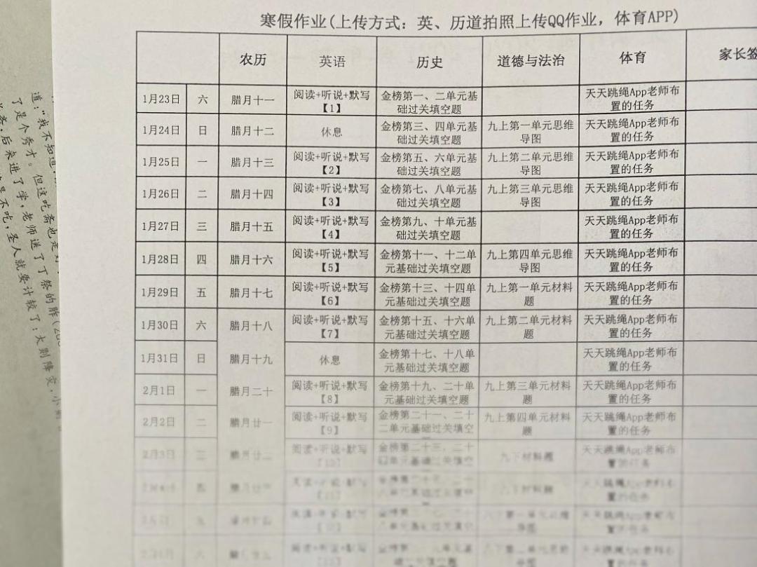 而学生也表示,自己已经是高中生了,还没有规划自己假期时间的权利,什么时候交作业,什么时候读什么书,全都被统一规划好了,况且大部分时间还要上网课。