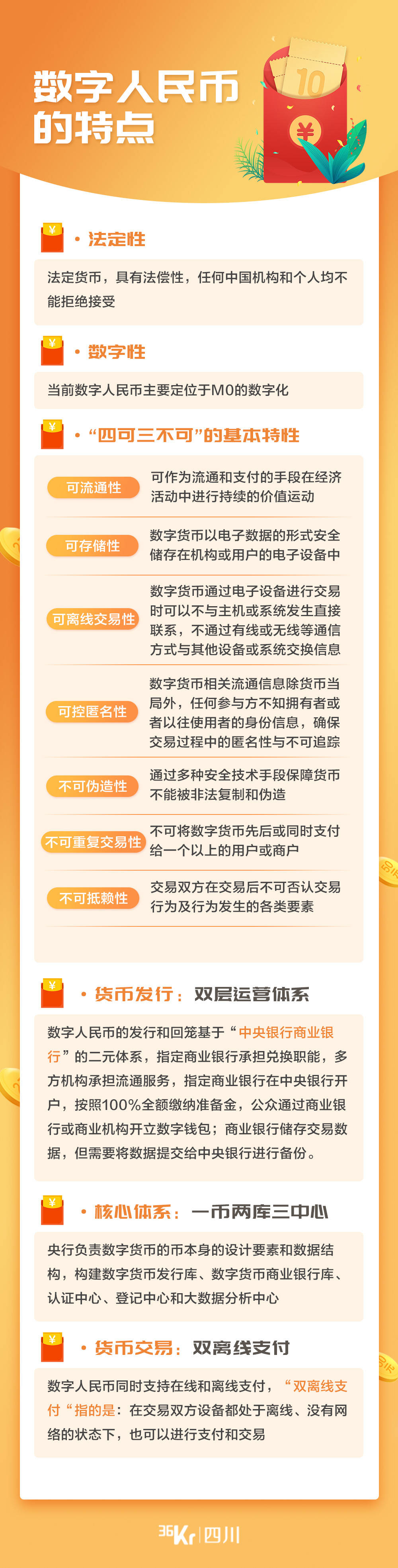 数字人民币大部分特点和现金无差别,如法定货币不能被拒收、可以匿名使用和可以离线使用等等。除此之外,虽然数字人民币看起来和电子银行、第三方支付平台的余额使用方法很相似,但数字人民币是现金的数字化表现,没有利息一说。