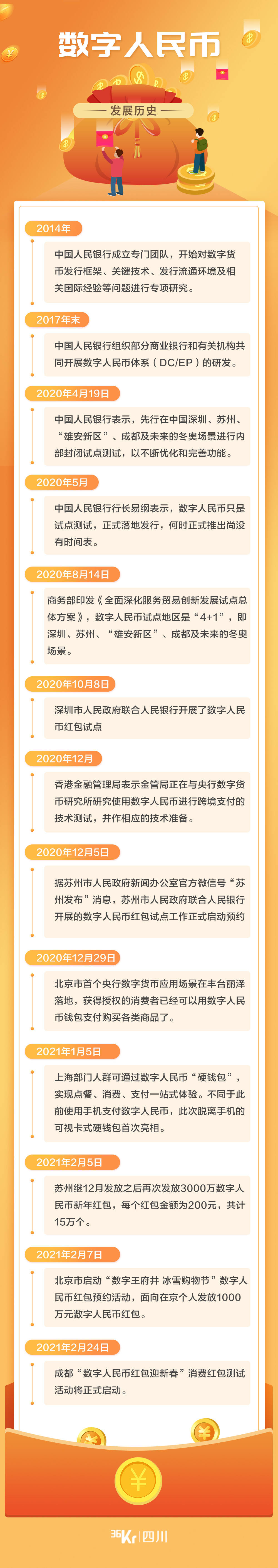 2014年,人民银行开始着手数字货币的研究。2020年,深圳、苏州、北京、成都、上海等地相继开始进行数字人民币的试点应用,但大规模发行数字人民币还没有固定时间表。
