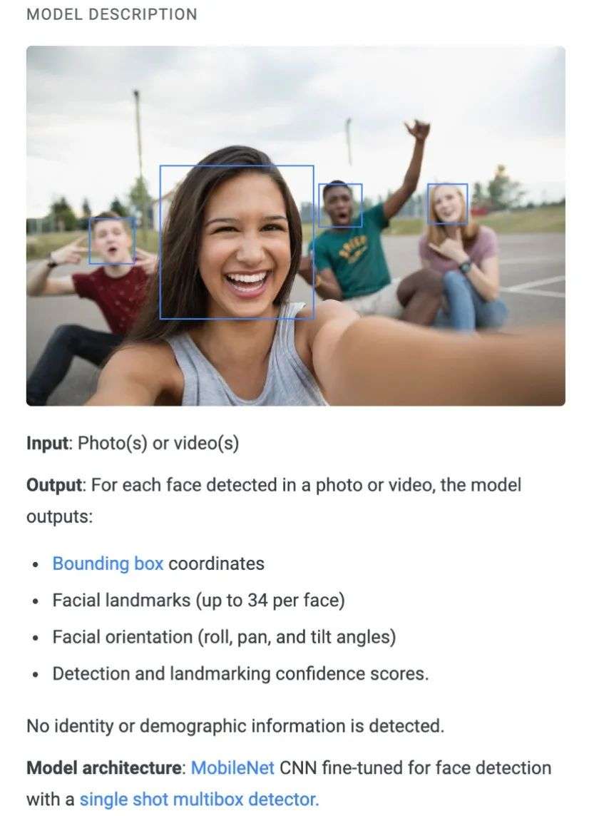 这项诞生于2019年底的技术尚未得到大规模落地应用。但谷歌在其主页上提供了关于模型卡应用的两个实例“人脸识别(面部检测)”和“对象检测”,以展示它的运作原理。