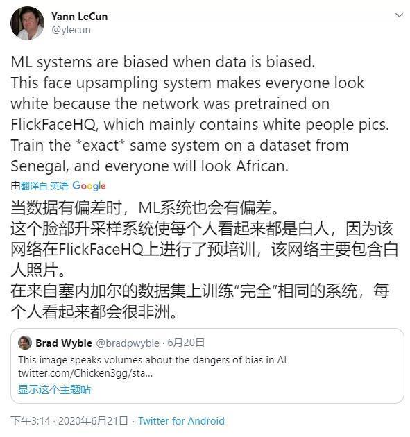 LeCun本来是为了解释算法偏见生成的原理,但他没能想到,最后这句打趣的话,被指有极强的种族歧视色彩,于是他被卷入一场长达数周的骂战之中。之后,LeCun不得不连发17条推文阐述逻辑,仍然不能服众,最后以公开道歉收场。