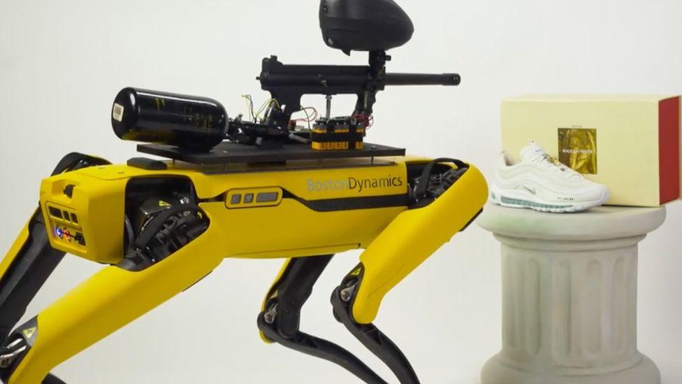 近日,在美国一家虚拟美术馆的艺术装置中,一个绑着.68 口径的彩弹枪的机器狗Spot被安置在其中。