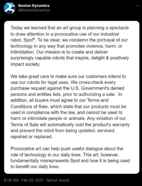「这种挑衅的艺术行为从根本上歪曲了Spot的使用准则,并且可能会对日常生活产生不好的影响。」并称这是对Spot机器人的「挑衅性使用」。