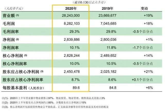 2020年上半年,奥园的总营收为282.43亿元,同比增长19.3%。不过毛利润增长只有18%,核心净利润增长14%,都低于营收增长。