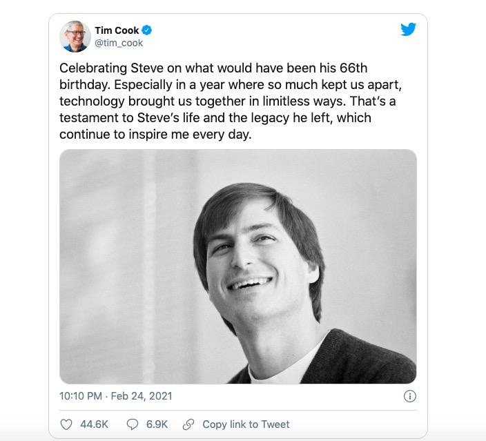 当天,库克在推特上发文纪念乔布斯。他表示,过去的一年是与众不同的一年,多重因素导致很多人被迫“分离”,但科技以无限的方式让人们团聚、团结在一起。库克表示,“乔布斯留下的‘遗产’,每天都在激励着我”。