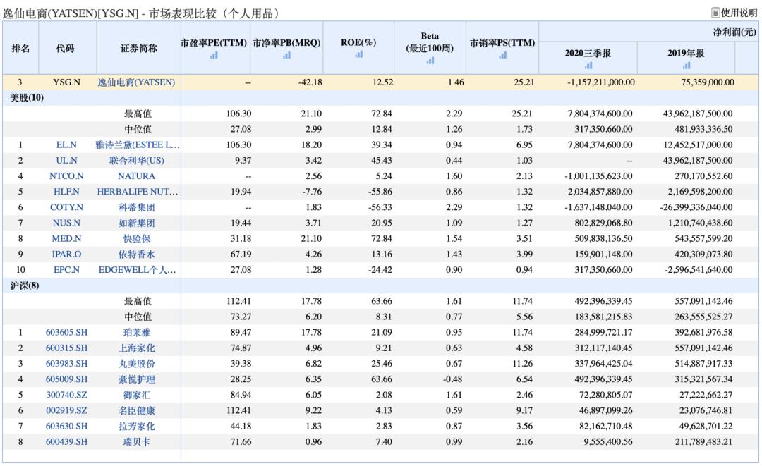 逸仙电商估值分析比较,对比沪深、美股wind个人用品三级市值TOP企业,图据wind,数据截止2月05日收盘