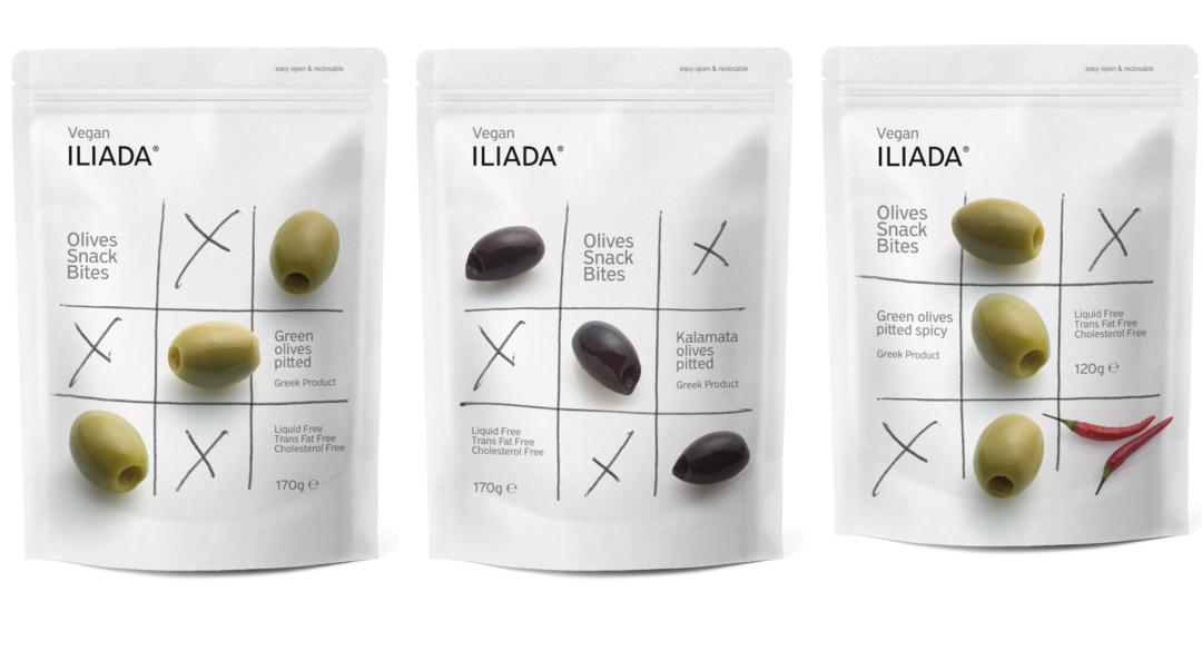 ILIADA橄榄零食(左一:去核绿橄榄, 左二:去核卡拉马塔橄榄,右一:辣味去核绿橄榄) ,图片来源:Packaging of the World
