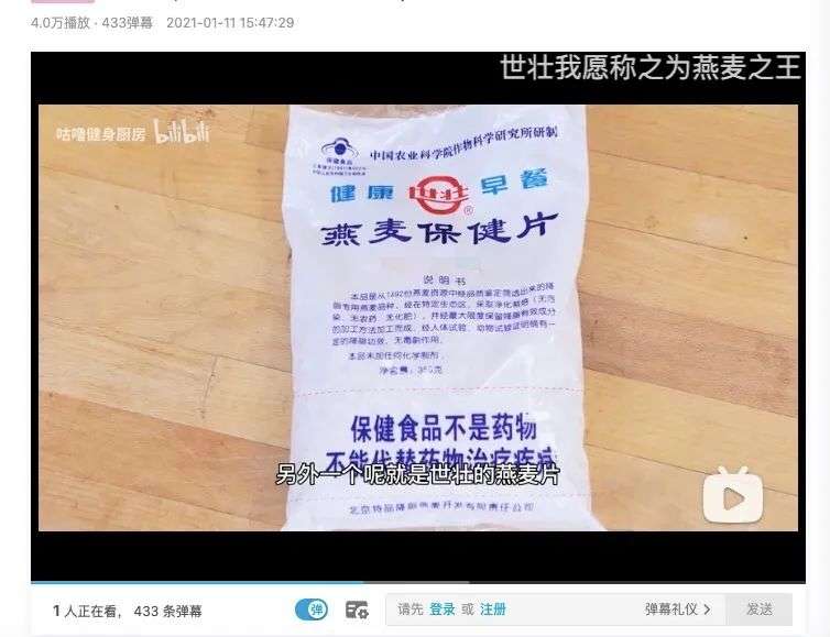 Bilibili上健身博主推荐世壮燕麦片,图片来源:Bilibili@咕噜健身厨房