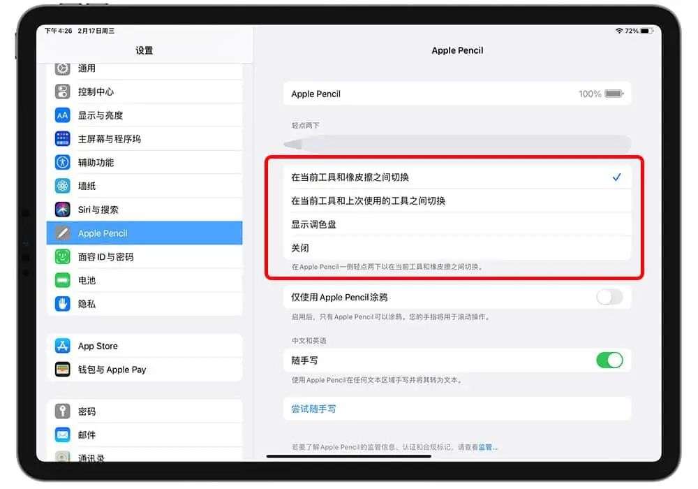 如果你的是第二代 Apple Pencil,还可以轻点笔身,切换工具。在设置中,你可以选择「当前工具与橡皮擦」、「当前工具与上一个工具」、「调色板」三种不同的功能。