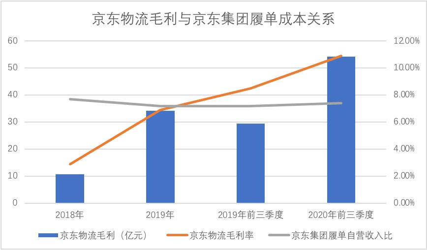 理论上,如果京东物流持续被集团压抑盈利性,以上两条曲线将大致呈现同步态势:京东集团履单成本增长不振,则物流业务的毛利率也不会有太大改善。显然,上图并不符合此规律:当京东物流毛利率飙升之时,集团的履单占比大致维持在同一区间内。
