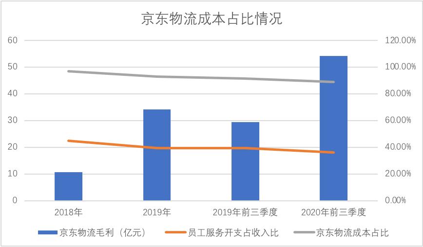 京东物流对集团定价保持恒定,毛利率的改善只能从成本节省中去找了,我们又找到了京东物流的成本结构,结合刘强东的“内部信”,是否通过员工成本压缩降低成本呢?见下图