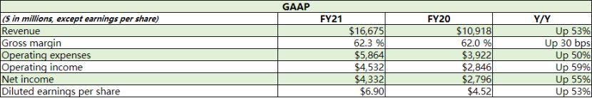 2月24日美股盘后,英伟达公布了2021FY业绩。报表显示,本财年公司GAAP营收同比增长53%至166.75亿美元;净利润同比增长55%至43.32亿美元;摊薄后的每股收益达到6.9美元,较上年同期增长了53%。