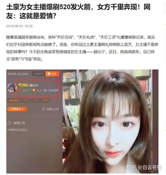 2019年6月,一则消息震惊了整个直播圈,斗鱼颜值区女主播顾北宁高调宣布,自己将退出直播平台,与自己的榜一大哥“S皇”奔现,抱得美人归的“S皇”瞬间被艳羡的目光包围,但和这个消息同样让人震惊的是,在此之前,“S皇”为顾北宁一口气刷了520个火箭。