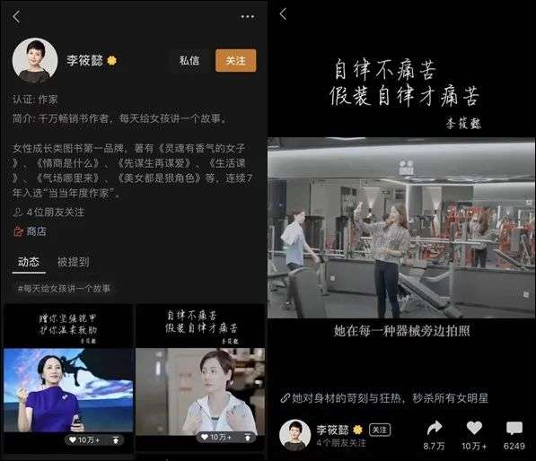 李筱懿,公众号“灵魂有香气的女子”的创始人,在她视频号中,视频里有讲述古今中外励志女性的故事,有热门女性电影的解读,也有亲自出镜的剧情演绎等。通过娓娓道来的方式,“每天给女孩讲一个故事”。