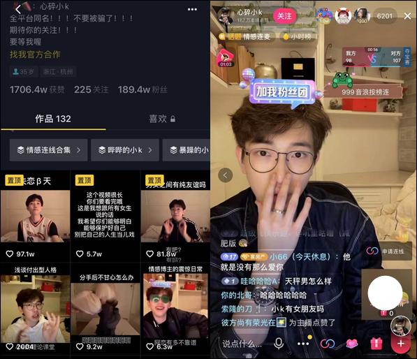 例如抖音情感主播“心碎小K”,账号粉丝总量为189.2万。在他的视频中,常常采用“暴力”输出的方式,解析日常情感婚恋话题,大部分作品点赞数在10万左右,广告接单量较少。