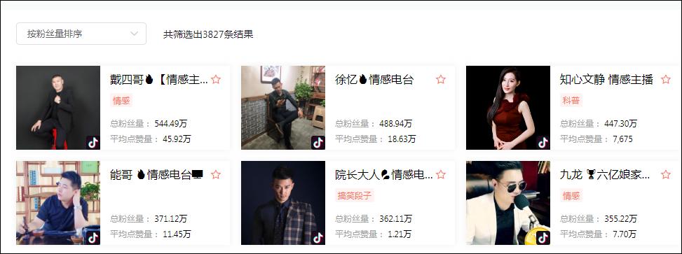 而目前,情感类账号也是短视频平台里体量最大的账号类型之一。小红通过星榜后台搜索“情感”关键词后发现,仅ID中带有“情感”的主播、达人账号就达到3828个,内容呈现形式上主要以导师等角色出镜讲解和剧情演绎两种居多。