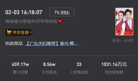 根据新抖平台数据,两人在2月3日,单场带货累计观看量就达到了659.17万,预估销售额1031.14万元。