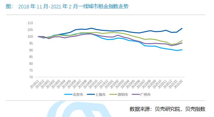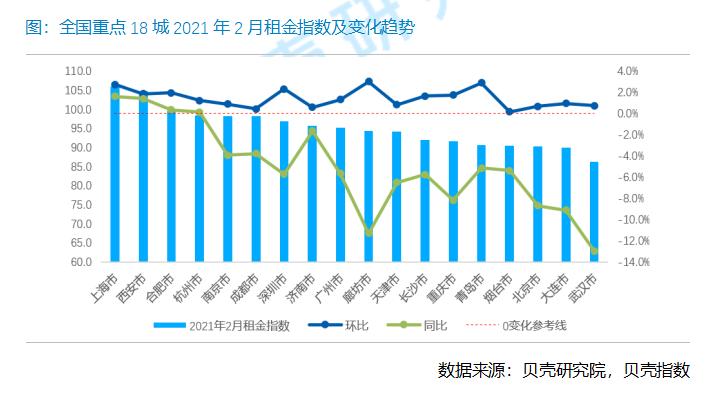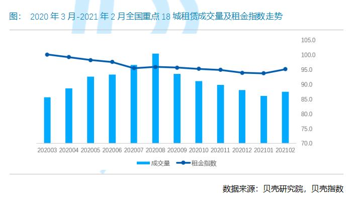 全国重点18城成交量环比上涨8.5%,租金小幅回升。根据贝壳研究院数据,2021年2月全国重点18城租赁成交量环比上涨8.5%,自去年9月开始,全国租赁成交量连续五个月环比下降后,首次环比止跌上扬,市场即将进入租赁旺季。从租金水平来看, 2021年2月重点城市平均月租金为42.1元/平米,平均租金指数环比上涨1.5%,同比下降5.0%。