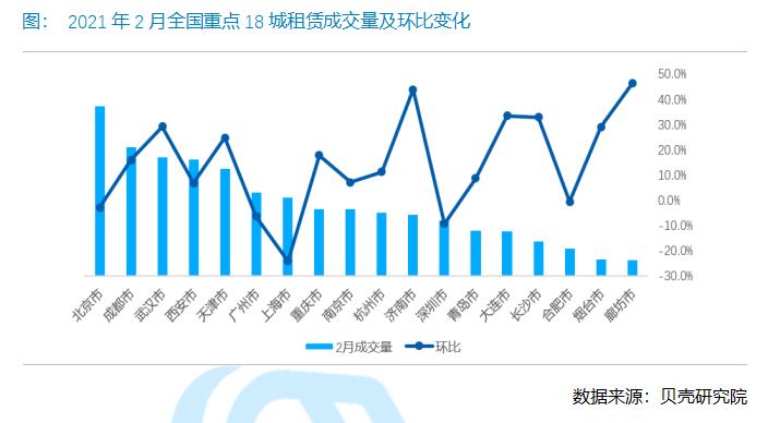 全国重点18城中,超七成城市成交量环比上涨。根据贝壳研究院数据,2021年2月全国重点18城中,除北上广深和合肥市成交量环比下降外,其余13城市均环比上涨,其中武汉、天津、济南、大连、长沙、烟台和廊坊市等7个城市涨幅超20%。由于疫情好转后抑制的租赁需求释放,廊坊市环比涨幅最高。