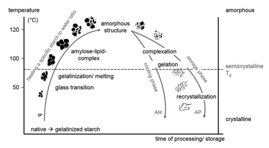 当糊化的淀粉进一步冷却与静置,它还会发生老化(凝沉)现象,也就是俗称的“回生”——本来已经被水分子渗透的淀粉分子重新排列成晶体,并把原先溶胀的水分挤出去,类似于逆向的糊化反应。
