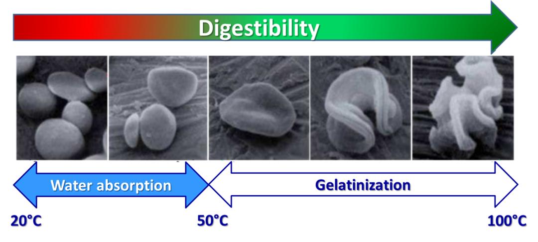 但值得一提的是,老化过程并不可逆——在淀粉老化以后,即便重新加热或是水煮,也已经无法再恢复同样的糊化状态。而老化后的淀粉,口感变韧,消化率也会降低。
