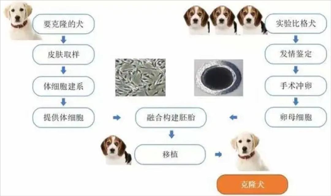 将被克隆宠物的体细胞核移植入去除细胞核的卵母细胞中,进行细胞融合,构建克隆胚胎,然后将克隆胚胎移植入代孕母体体内