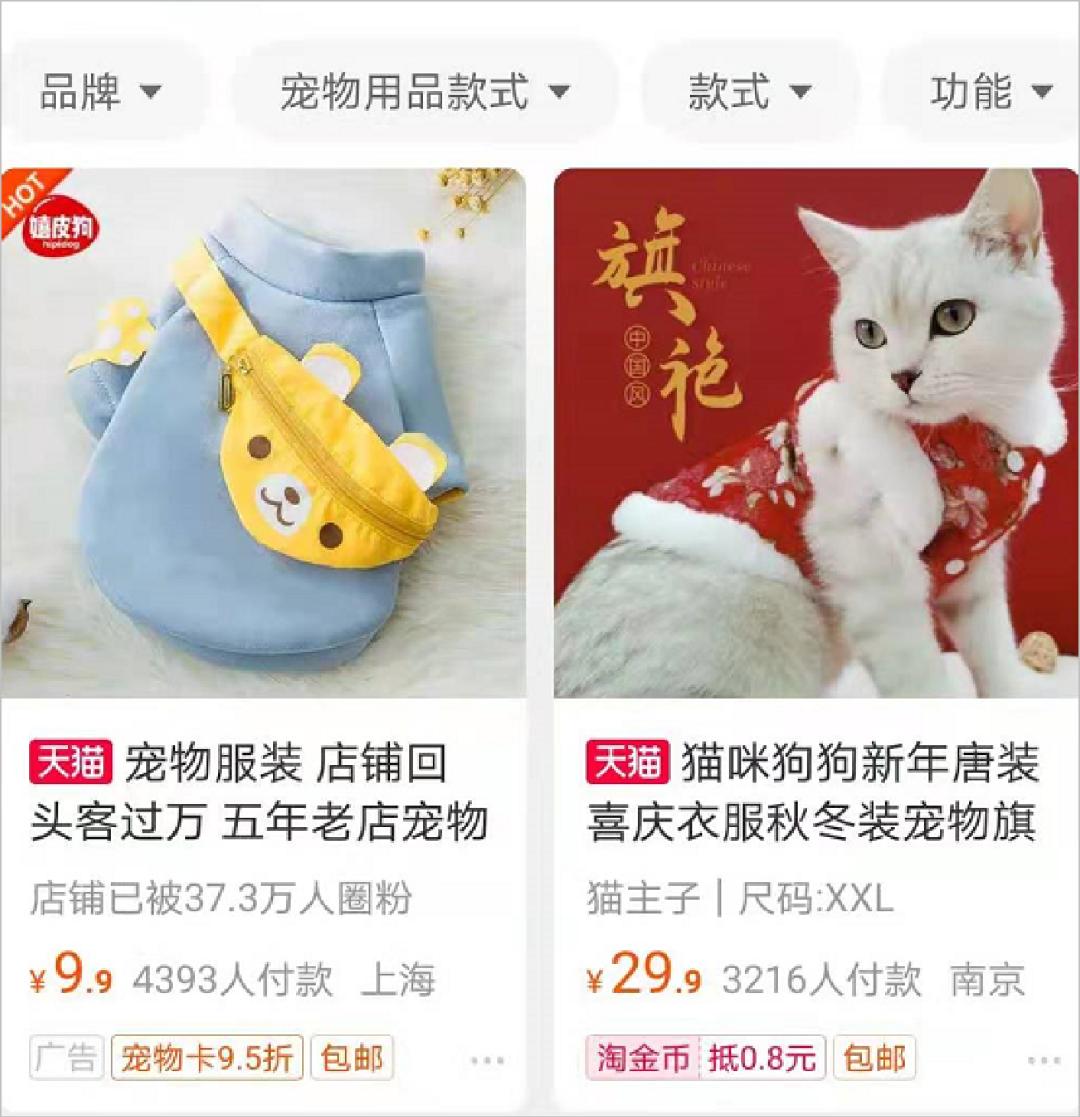 在某宝上,一件普通的宠物外套价格二三十元,但成本大多不超过十块,几家店铺都月销量几千单。我粗略算了一下,很多店铺一个月的流水就四五十万。