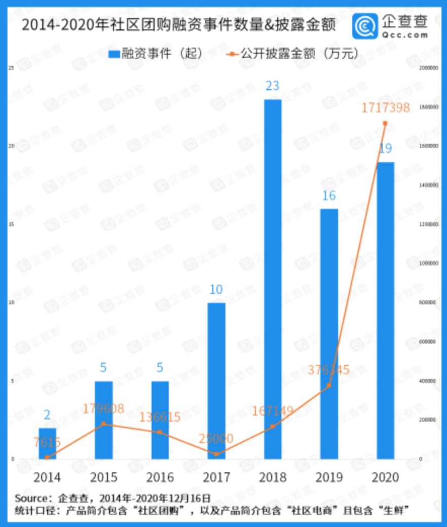 根据企查查《2020年社区团购投融资数据报告》显示,2020年社区团购公开融资事件达19起,是历年来的第二高,但2020年社区团购披露融资金额高达171.7亿元,同比增长356.3%,创历史新高。